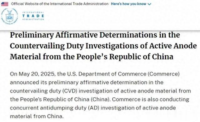 据中国贸易救济信息网消息股票配资服务门户导航,2025年5月20日,美国商务部发布公告,对进口自中国的活性阳极材料(Active Anode Material)作出反补贴初裁。